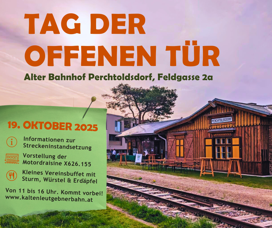 - Am alten Bahnhof Perchtoldsdorf öffnen wir am 19. Oktober 2025 die Türen und präsentieren dabei unsere frisch aufgearbeitete Motordraisine für Bahnerhaltungsarbeiten. Für das leibliche Wohl ist natürlich gesorgt!