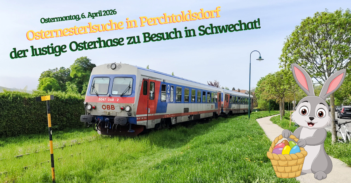 - Am 6. April 2026 laden wir wieder zu unseren beliebten Osterfahrten ein: Mit Osternesterlsuche am historischen Bahnhof Perchtoldsdorf und Besuch des Eisenbahnmuseum Schwechat mit historischem Fahrbetrieb erwartet Sie ein abwechslungsreiches Familienprogramm. Die Fahrten sind bereits buchbar.,