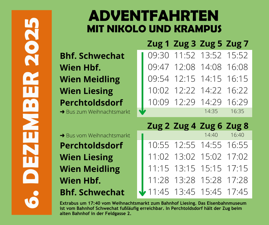 Unser traditioneller Sonderzug zwischen Schwechat, Wien und Perchtoldsdorf fährt heuer am Nikolotag. Es erwartet Sie ein vielfältiges Adventprogramm: